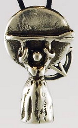 The seer, herbalists, and healer of villages and towns, the Wise One is depicted within this pewter amulet as a woman in a dress, raising a broom before the full moon. Use her as a focus to bolster your will and determination, or invoke the spirit of the Wise One to aid you in sweeping away illness, despair and or achieve knowledge and understanding within your meditation. Hanging 1 1/4" long and strung upon a nylon cord, this amulet is accompanined by a small 1/2" diameter pewter pentagram
