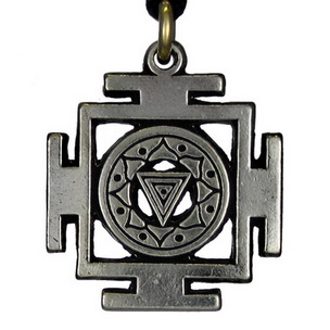 The Kali Yantra is a symbol combining the transformative energies of Kali, within the “Yantra”, a geometric symbol used to focus the mind. Drawing, wearing, or concentrating on this symbol is said to have both spiritual and Magickal Power. At the center is a small dot, the bindu, point of creation. It also represents Kali, as Shakti, the activating energy of creation. Surrounding the Bindu are five concentric triangles that represent the five Koshas. The koshas are the sheaths of the human condition. The physical sheath is known as, the Annamayakosa; the life force is the Pranamayakosa; Manomayakosa is the mental/emotional sheath; Vijnanmayakosa is wisdom; and Anandamayakosa is Bliss. The two circles are symbols of life and death. The Lotus blossom symbolizes the eight chakras and the eight principles of Prakriti; the manifesting universe; earth, air, water, fire, ether, manas Lower mind), buddhi (higher mind), and ahamkara (ego).