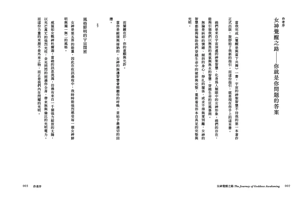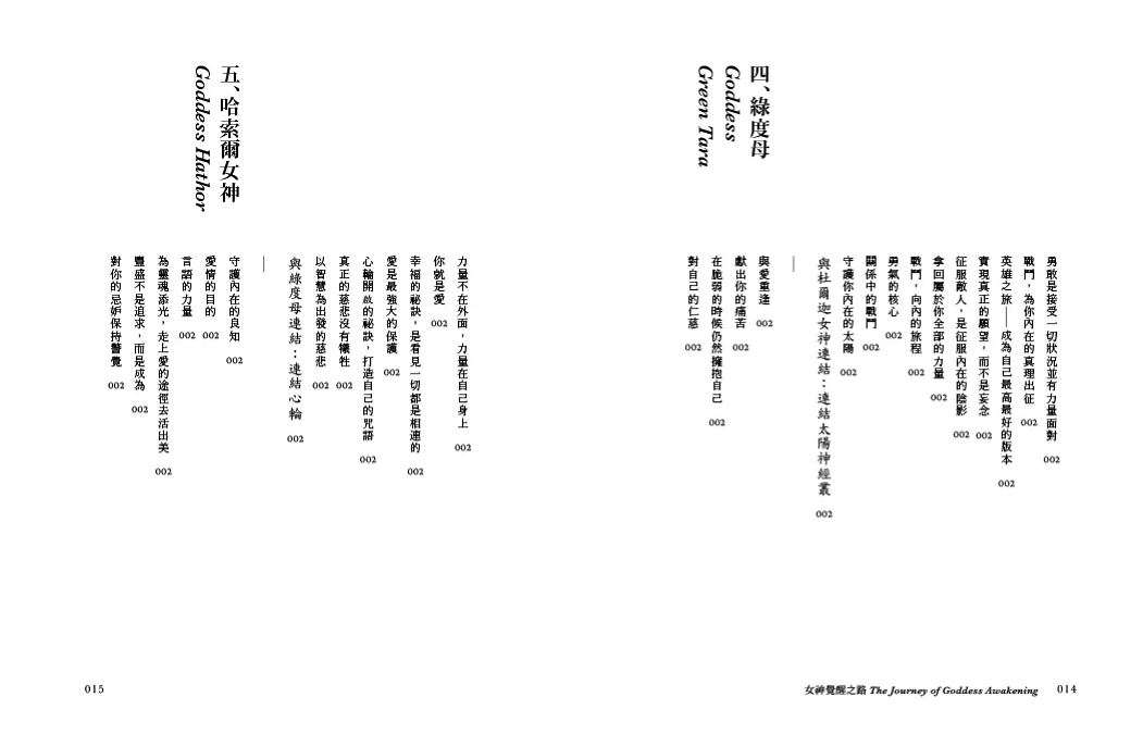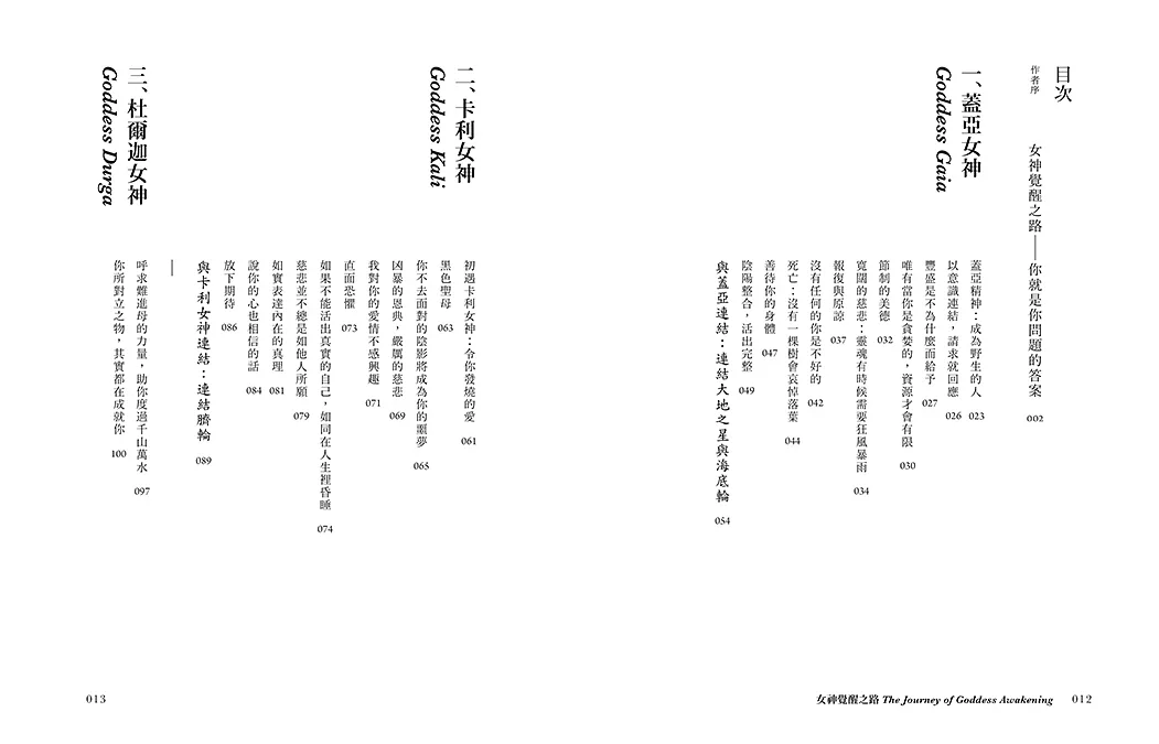 本書分為八個篇章,由蓋亞、卡利、杜爾迦、綠度母、哈索爾、愛西斯、聖母瑪麗亞與觀音八位女神引領,以其各自的獨特能量,為我們清理潛藏於脈輪之中的恐懼、陰影或生命難題。只要我們願意開口呼求女神,將自己全然地交出,就能在女神的引領下穿越風暴,走向輕盈豐盛的人生。