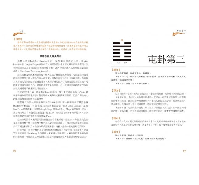 全書的編排流暢,好讀好懂,除了收錄卦辭、爻辭,並配有譯文和啟示、疑難解析,提供詳細白話的解說,再附上古往今來,相關經營方面的參考意見,能對讀者有所啟發,自然運用在自己的事業、生意和生活處世中,相信能取得理想的成就。