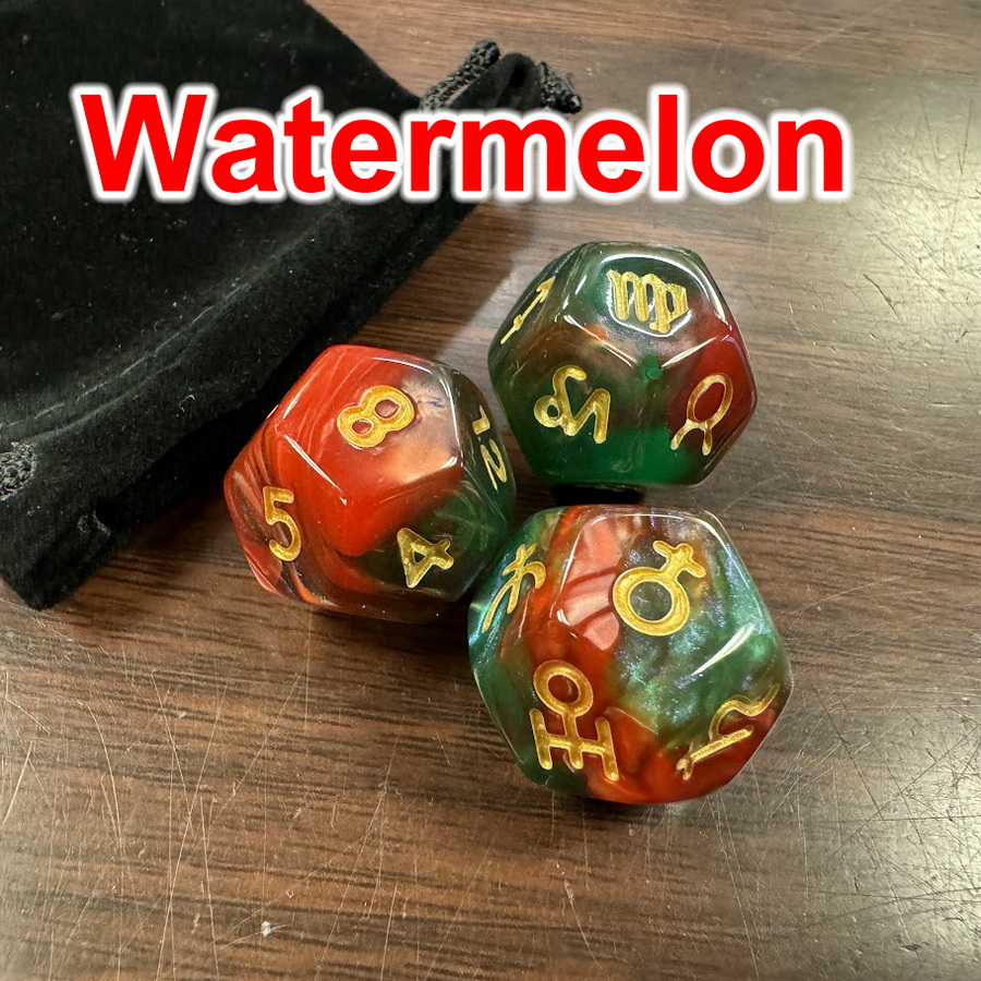 Contains: 3x12 sided dice, 1 velveteen pouch, instruction included