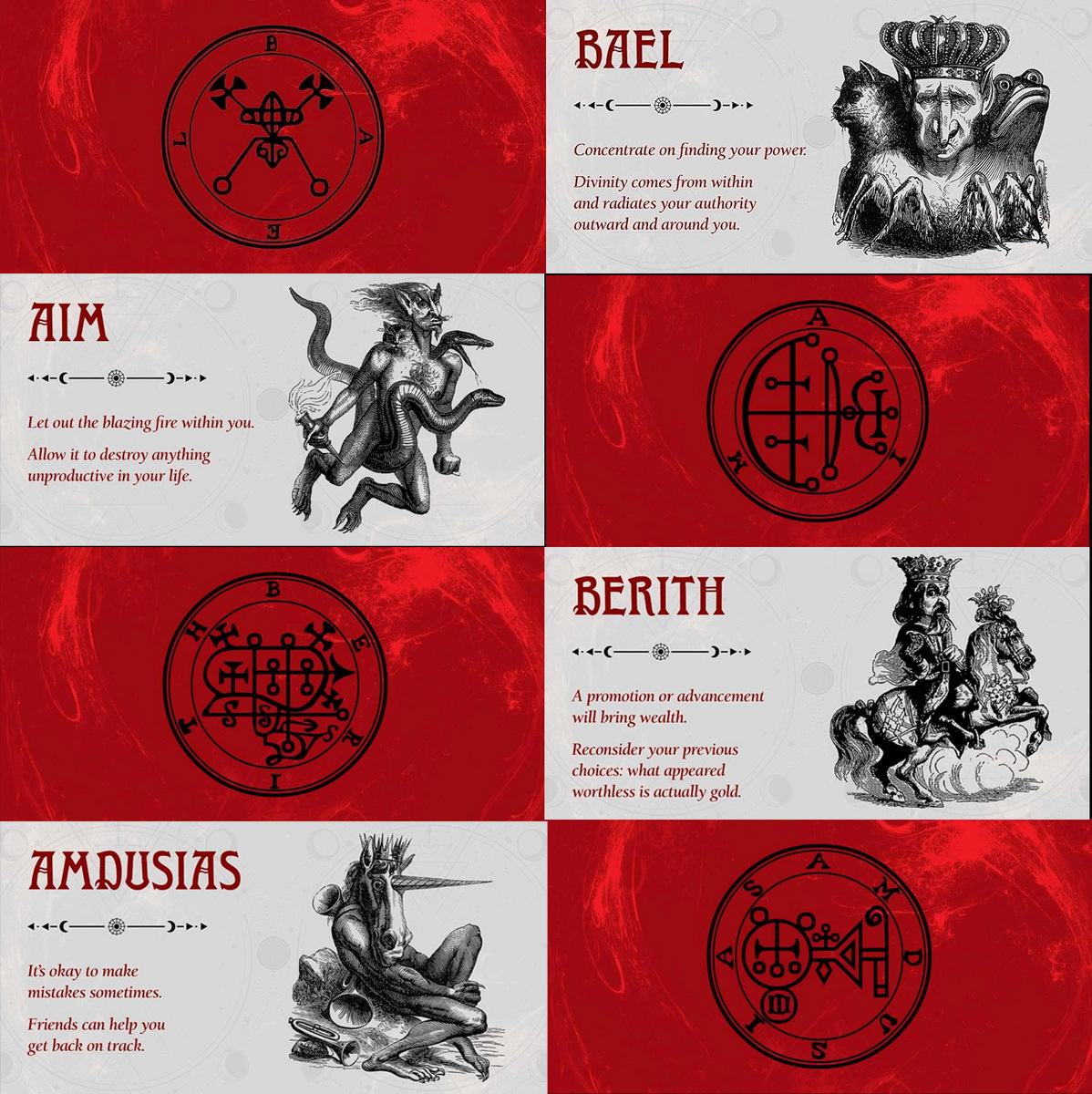 These 40 cards contain messages from the Goetic demons, a group of infernal spirits that helped King Solomon build his temple during ancient times. Just as they helped the biblical king to accomplish his work, these demons can assist you in overcoming your weaknesses by revealing the truth hidden in the shadows. The sigils on the back of each card use Kabbalistic magic to connect you directly with a Goetic demon. Shuffle the deck while thinking of a question or problem you are facing, then draw a card and let the wisdom of the servant demon assist you. The message might answer your question or provide a suggestion that will help you move forward. Try drawing a card after waking up each morning to fill your entire day with fiery, infernal energy. These cards may also be used as a companion to the Occult Tarot to provide added clarification during readings.