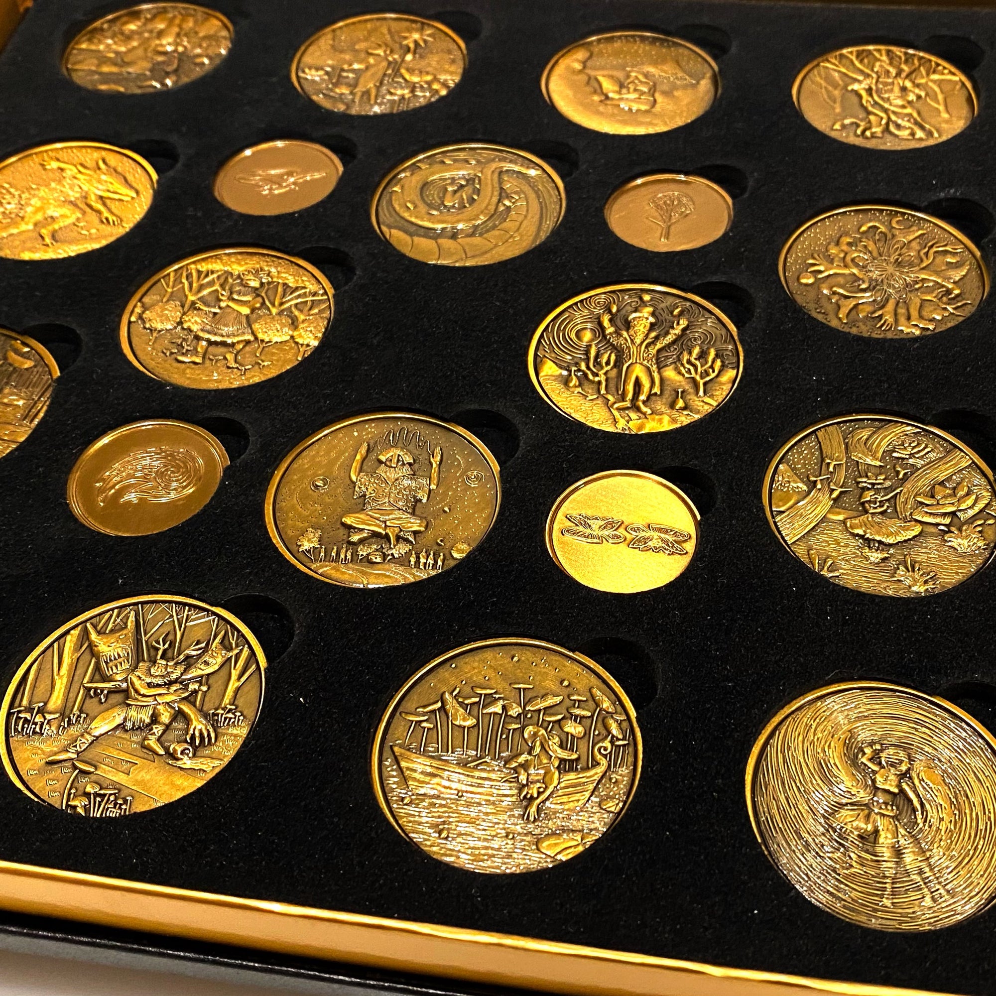 Geomantic Visions is a set of 20 gold-plated zinc alloy coins in an 8" x 8" keepsake box with a manual on Geomancy.