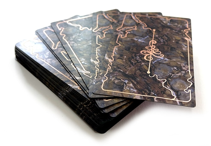 Each card has a number (00-77) that can be easily referenced in the included book. The back of the cards are identical. Cards are illuminated with rose gold foil accents. The cards have metallic dark forest green gilded edges. The marbling pattern is something that I created with traditional Ebru marbling techniques.