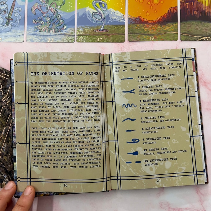 The book is around 100 pages and is in full color. The cover of the book is wrapped with marbled fabric and stamped with a foil compass. Within the book is a 25-page introduction to the Oracle, 5 unique spreads, and notes on Numerology, Tarot, and deciphering paths. Each card has its own dedicated page that includes: