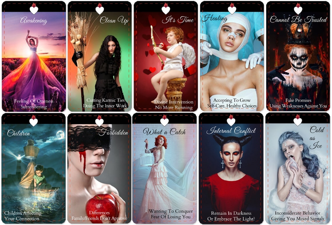 This is a Twin Flame Focused Tarot and Oracle Deck! You have 78 Tarot Cards and 32 Oracle Cards to help clarify messages and go deeper within the connection. The Tarot cards have black hearts and the Oracle Cards have the white hearts