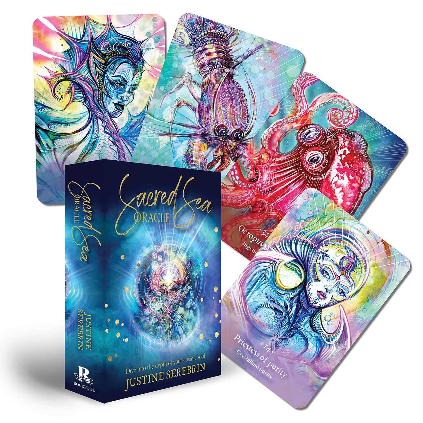 The Sacred Sea Oracle was inspired by the lost land of Lemuria and by extraordinary visions and channellings seen in meditative journeys. In this oracle you will find images of the most revered and powerful energies deep within the sacred sea painted by intuitive visionary artist Justine Serebrin.