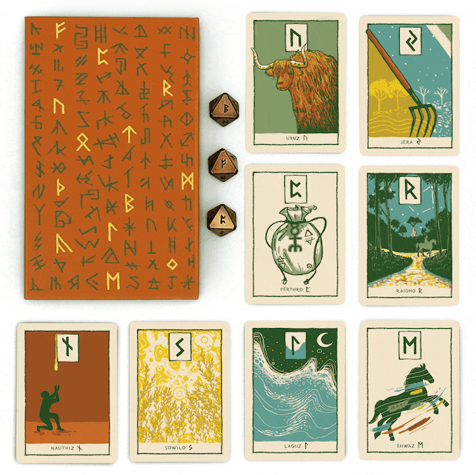 This deck is my take on the Elder Futhark Runes, an early Nordic system of divination that has been around for millennia. Typically, runes are found in the form of stones, dice, talismans, or other objects with carvings. When I first started to learn about runes, I found it difficult to relate the Nordic symbol to the meaning. To help myself better understand the meanings behind each rune, I created this deck of cards. Each card has a runic symbol, the traditional name, and an image that encompasses the meaning behind the symbol. What is helpful with the Elder Futhark Runes is that the meanings are relatively simple. Each rune conveys a concept or feeling that was prevalent thousands of years ago and still remains relevant today. The included dice provide an alternate way to draw runes in a reading. -James