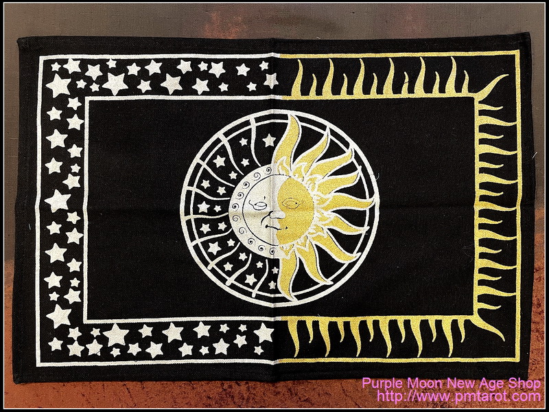This is an altar cloth with two different interlinking Sun designs. The sun represents the masculine energy with firmness, strength, and power. Silver and gold with a black background. Sizes and shapes may vary slightly from piece to piece.