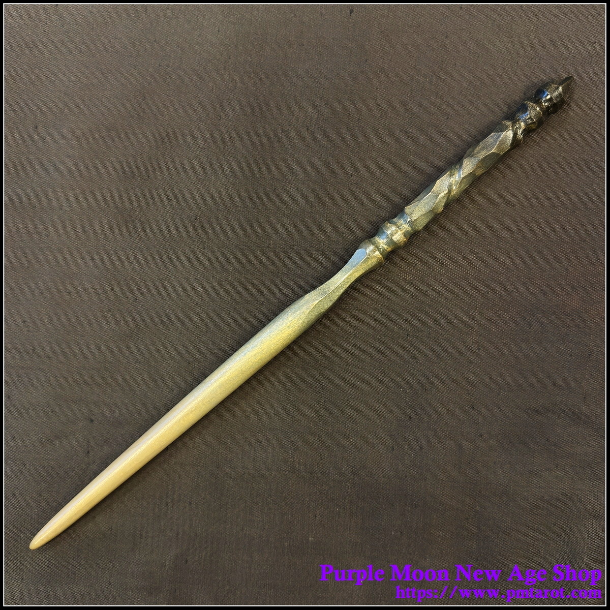 This wand is made from one piece of Birch, making it nice and sturdy for years of spellcasting. The handle has been given a solid dark stain; the tip has had the stain rubbed off, leaving the grain to show through.