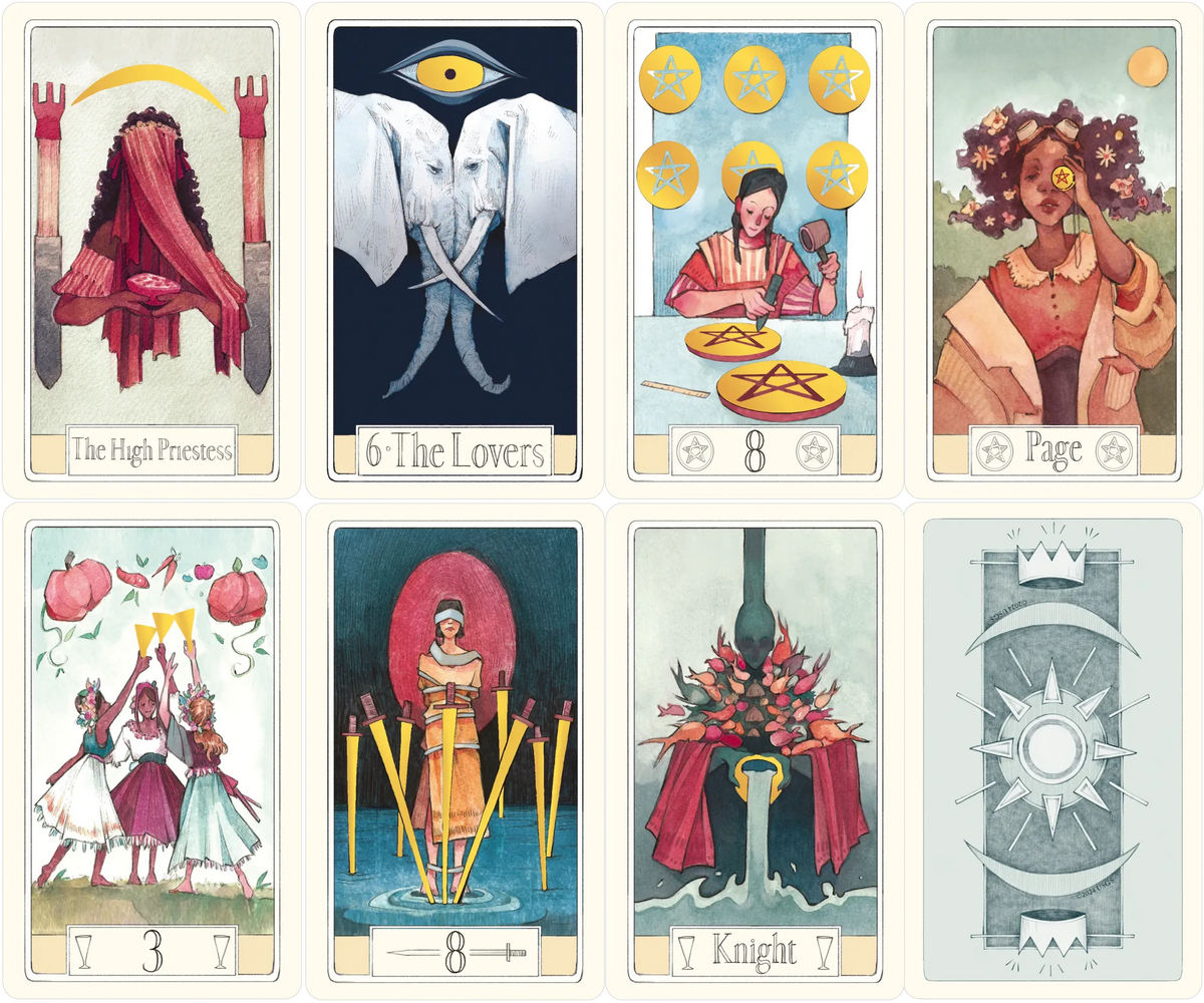 Bring your inquisitive mind and your sense of whimsy as you embark on your tarot adventure, for there is no journey to be had without a curious traveler. Composed of charming watercolor illustrations, Curious Travels Tarot Deck shares precious tales of wonder, love, disappointment, and new beginnings. These insightful stories are ever changing and when reading with this delightful deck, you become as much a part of the narrative as the elephant Lovers and the wise owl Hierophant. You will find strength in the lion’s gaze and hope as you dance among the stars. Your great adventure awaits. Includes 79 gold-foil accented cards with linen finish and an 84-page illustrated guidebook.