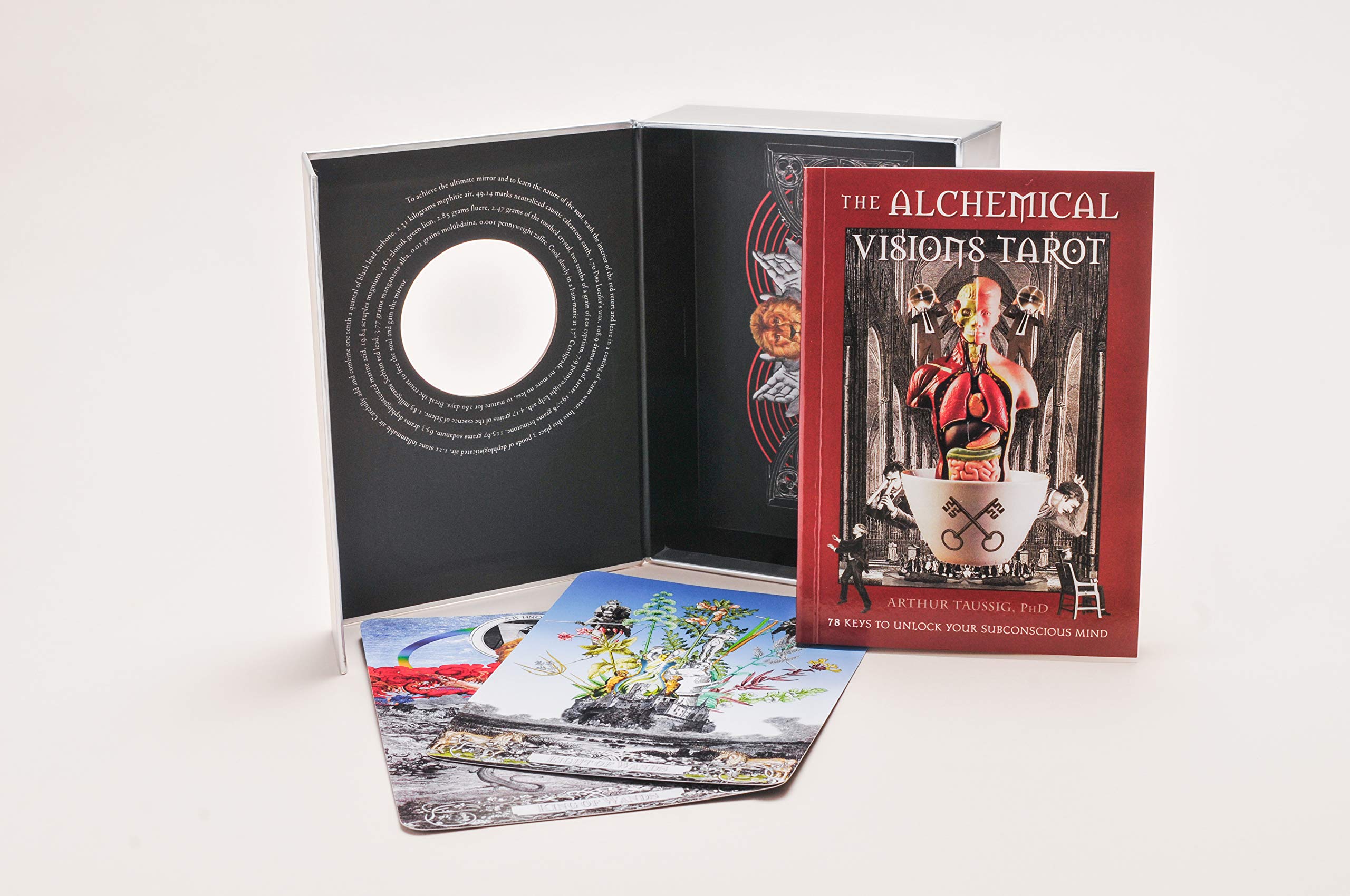 The Alchemical Visions Tarot brings the promise of the Magnum Opus—the Great Work—to travelers on the modern path. Combining Jungian psychology and ancient alchemy, mysticism, and mythology, world-renowned artist Arthur Taussig has created a powerful tool for self-transformation—a Tarot for personal alchemy and psychic health. These complex and beautiful cards are rich with multiple layers of symbolism and are meant to be studied one by one so that each card becomes a key to unlocking the subconscious mind. Each card is an important stop on the Traveler’s journey from an unconscious state to one of integrated conscious wholeness.