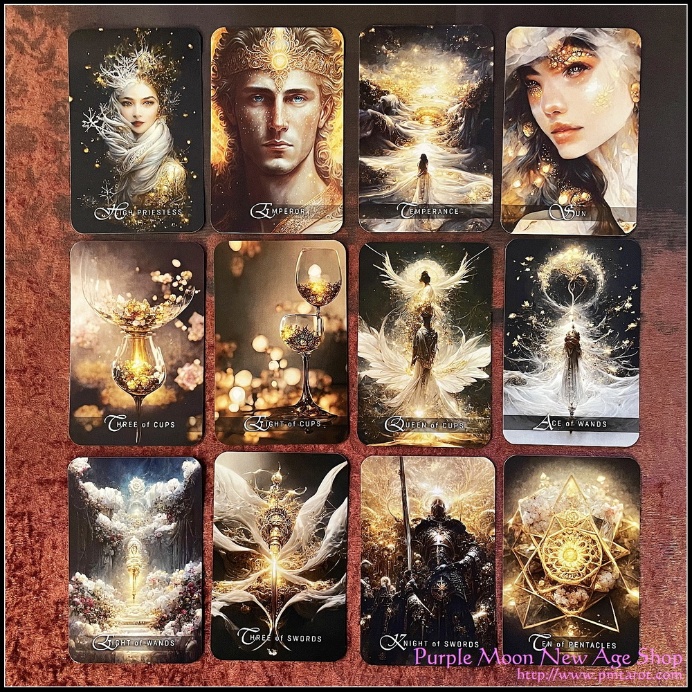 A tarot deck includes 78 unique tarot cards designed by Artificial Intelligence with a comprehensive guidebook.