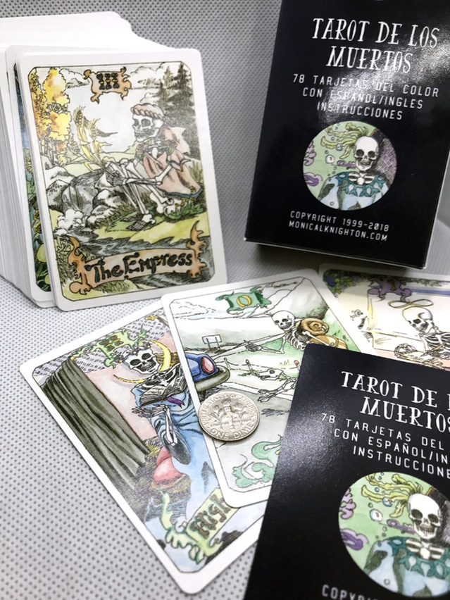 This item is required advance payment to order and estimate arrived in 3-6 weeks.The Tarot of the Dead is a full color 78 card Tarot Deck inspired by the Mexican Day of the Dead (Dias de los Muertos), and created by Austin, Texas artist Monica Knighton. In the tradition of the holiday, the human figures on the cards are represented by skeletons. The suits are as follows:
