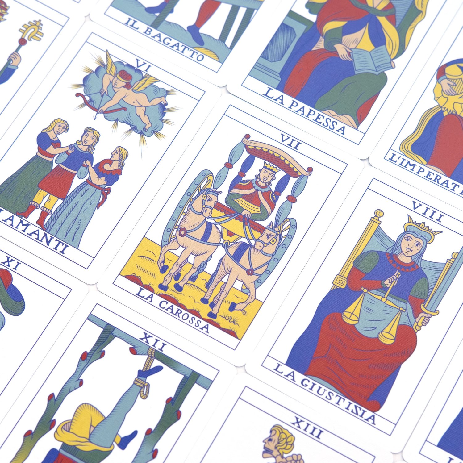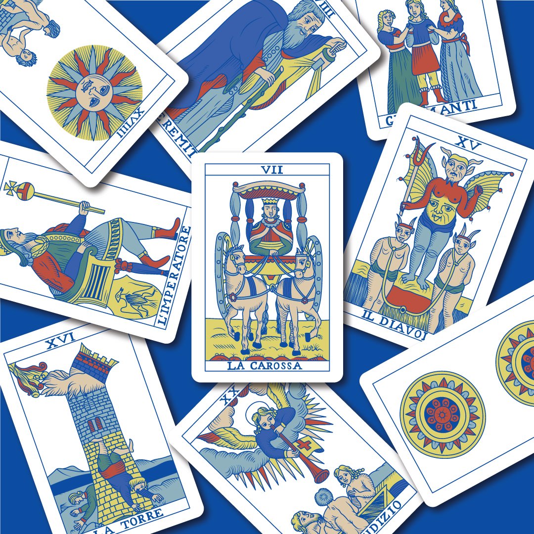 This deck includes the twenty-two trump cards plus the two of coins. The titles of the cards are in the original Italian. This first edition is limited to 500 decks. Each deck is individually numbered on the seals.