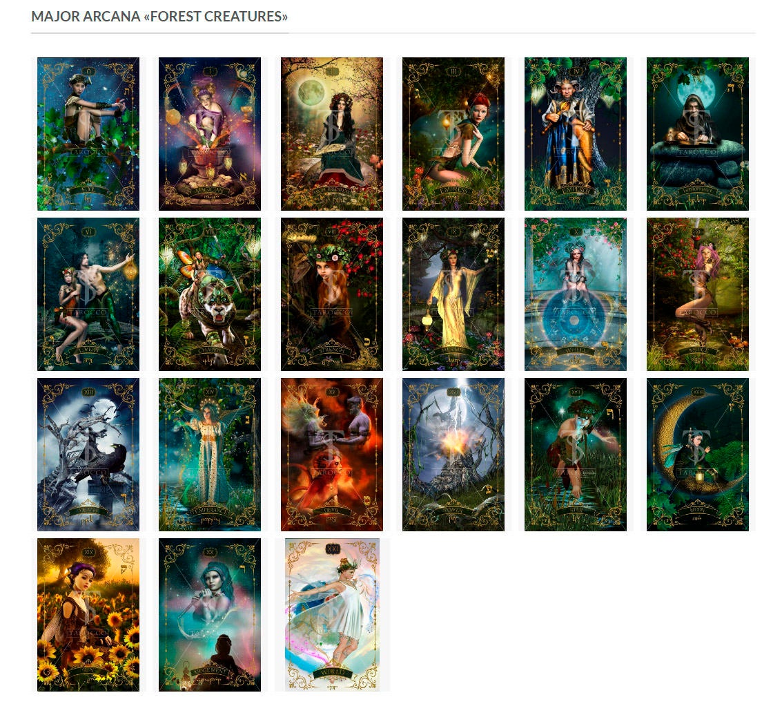 The unique Forest Creatures tarot deck. Let the Elves from the fantastic forest bring you into a magical atmosphere and share their secrets with you. The mysterious creatures have appeared in the writings and fairytales many centuries ago. They have always surprised everybody by means of their extraordinary abilities. Now they are ready to share their secrets with you.