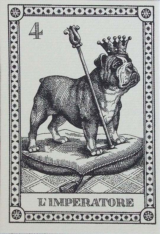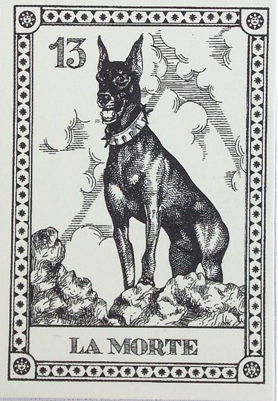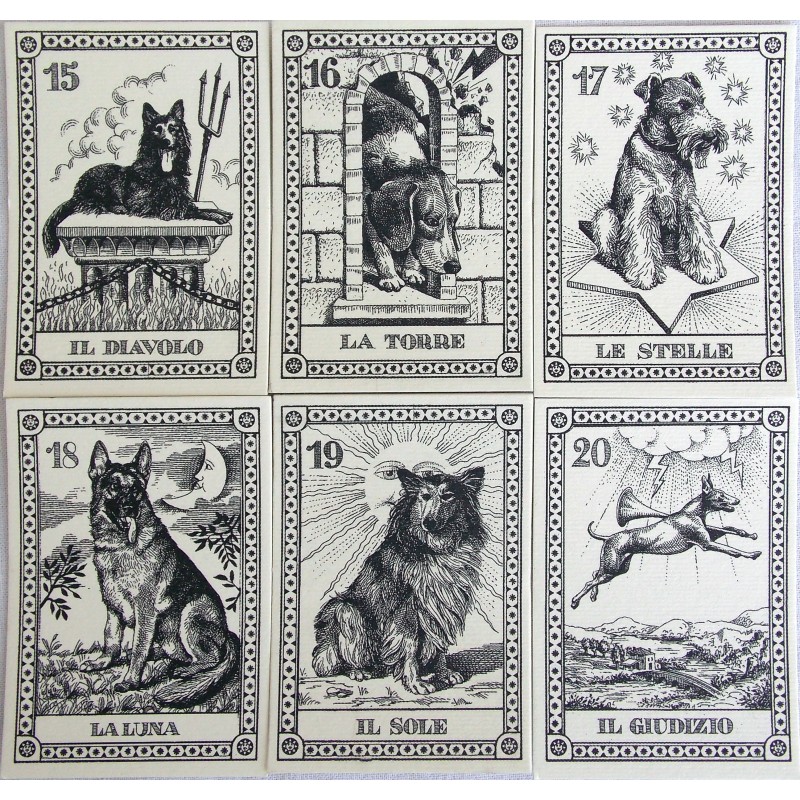 A numbered edition of 22 tiny black and white drawings depicting dogs in the traditional symbolism of the Major Arcana characters. Card titles in Italian. Printed on heavy ivory paper and packaged in a hardcover case with tie ribbon. A charming gift for dog lovers. This is the second edition limited to 2,000.