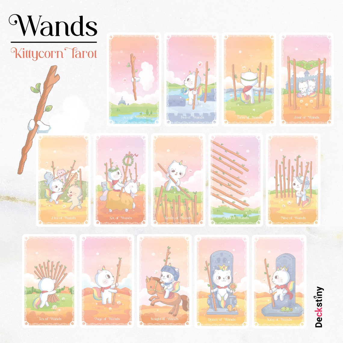 The Kittycorn Tarot is based on the traditional Rider-Waite Tarot deck. The white Kittycorn with his rainbow horn and tail with his adorable friends. Coloring by Magical Pastel.