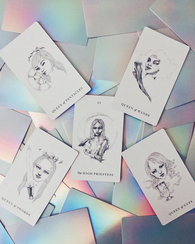 78 cards total, major and minor arcana, 350gsm cardstock with full holographic backing