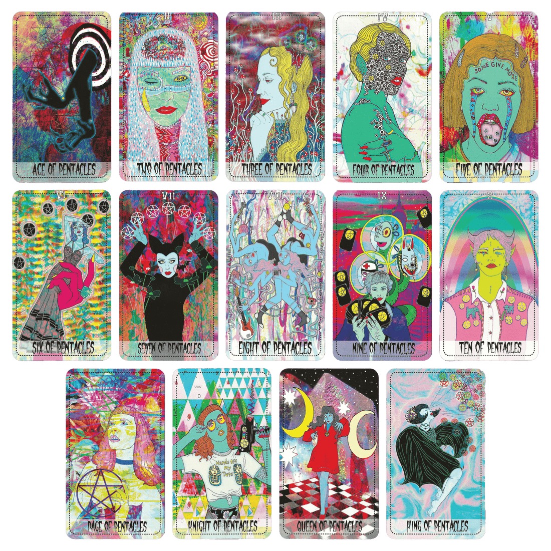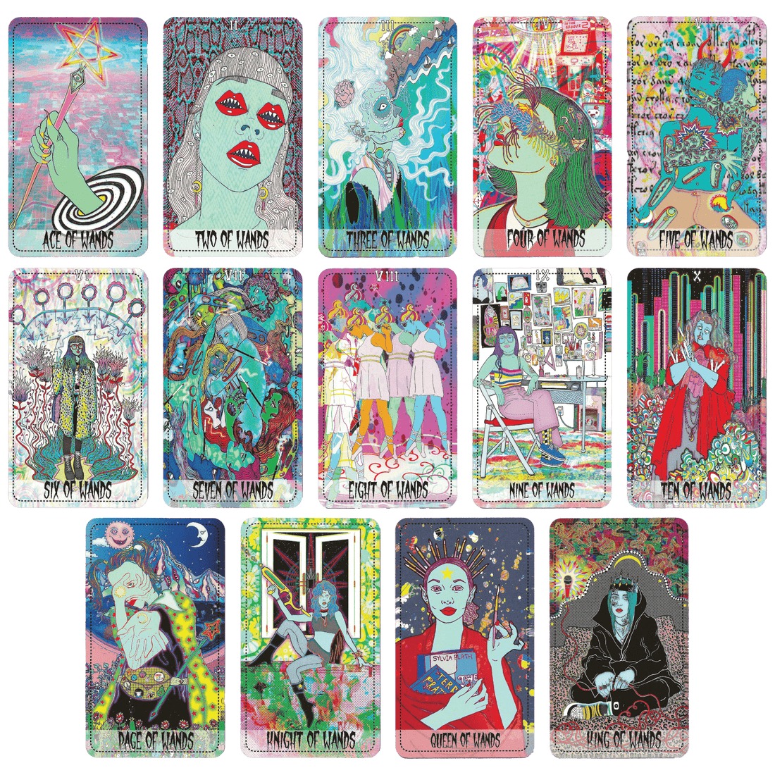 In Rider-Waite style, we see cups, wands, pentacles and swords, but each character has made their card their own, so you might have to search to find the suit!