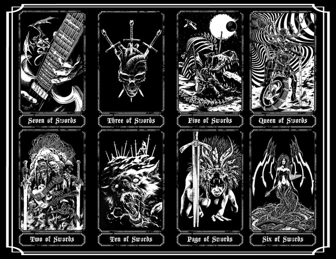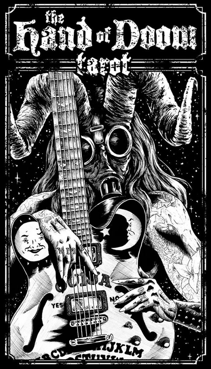 The Hand of Doom tarot. A 78 card tarot deck based on the classic Rider-Waite arcana but featuring brand new Doom Metal and Dark Fantasy themed artwork. Guitars and amps compete with monsters and magic to determine your fate. Tattoos and Fae, Werewolves and Whiskey, Science Fiction mixed with Sorcery. Saddle up a Chopper or saddle up a Dragon, spark one with a Goblin, lay down some tracks in the upper atmosphere with a Supernaut. Pure 70s Pulp is represented in each card. Follow the smoke to the riff filled land.