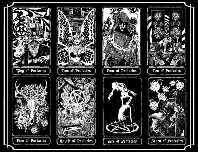 Each card was hand drawn in ink by Jonathan Grimm, creator of The Bound Tarot.