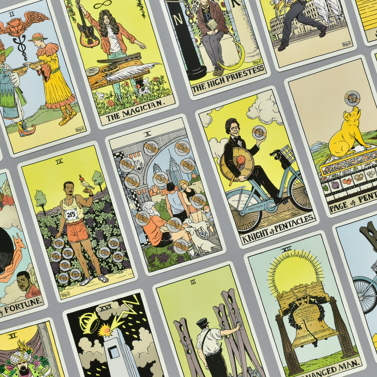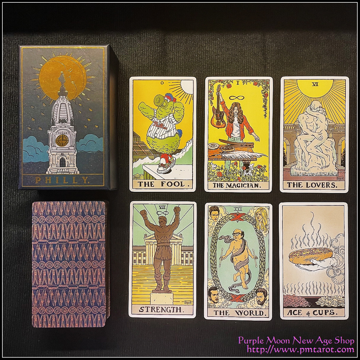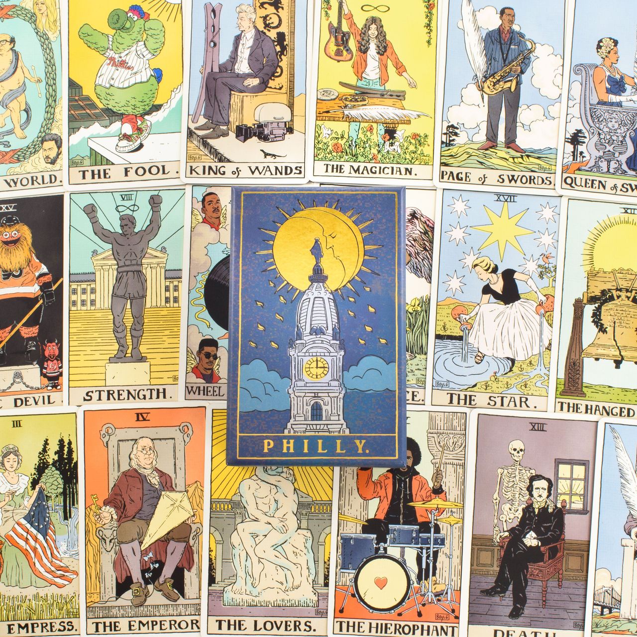 This beautifully designed, witty Philadelphia-themed Tarot card deck features 78 illustrations featuring beloved Philly cons. Local artist James Boyle was originally commissioned to illustrate a story about tarot cards for a magazine and the 3 Philly themed cards he created were such a huge hit he turned them into a full tarot deck! The deck comes complete with an accompanying guidebook by Gina Tomaine - the author of the article about tarot decks that James create the original images for! Beautifully packaged and printed with shining gold edges and a matte UV finish, these cards make a wonderful gift or keepsake and also look stunning when framed all together or in sets.