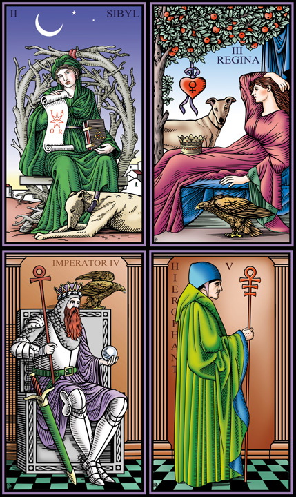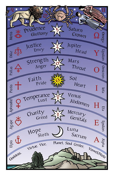 The seven planets were thought of as the soul centers of the cosmos and corresponding soul centers could be found ascending the spine, from the sacrum to the crown of the head, in the microcosm of the human body. Pythagoras developed the diatonic music scale with seven notes to capture the sound that each planet made as it orbited the Earth. This was called the music of the spheres. He marked each note with one of the seven vowels of the Greek alphabet and through a musical treatment used this scale to bring the human soul centers into harmony with the planets. These notes functioned as virtues meant to heal each soul center. Later, lists of seven virtues meant to cure seven vices-each associated with a soul center-began to appear in Hermetic, Gnostic, and mystical Christian philosophy. I believe that the Tarot’s trumps depict Virtue driving an ascent through the seven soul centers depicted repeatedly on three levels, corresponding to the three Platonic soul levels. The final achievement of this ascent is illustrated on the Soul of the World card, which depicts Prudence/Sophia as the light of higher consciousness and the true food of the soul.
