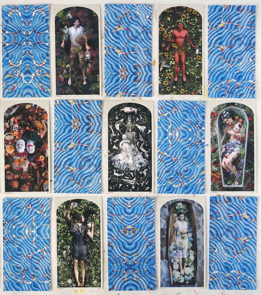 Our new seasonal Tarot created in the artist’s gardens in Ghent, New York and Morlaix, Bretagne. Printed on oversize 6” x 3” high quality playing card stock with curved corners for maximum durability. Includes 5 bonus images and 1 title card for a total of 84 cards.