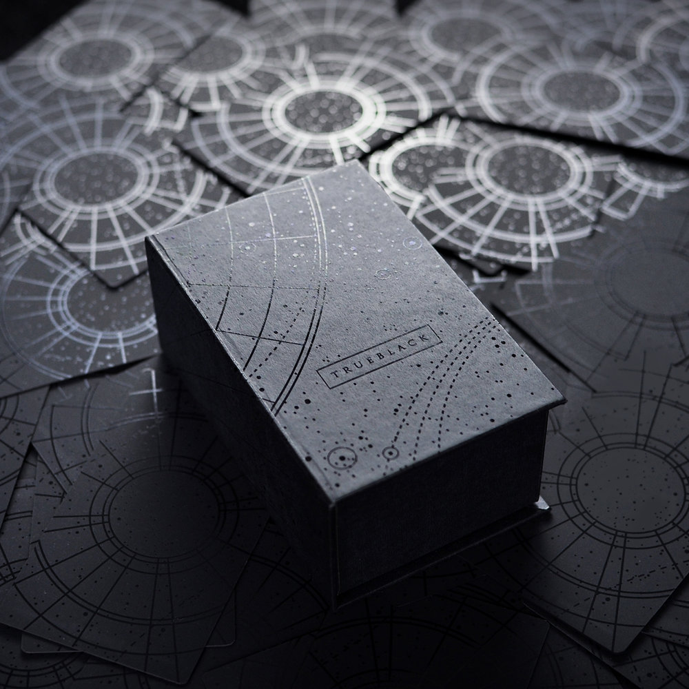 True Black is a 78-card tarot deck, complete with magnetic closure box and accompanying booklet. The box, booklet, and every card's front and back are adorned with black-on-black gloss/foil stamped designs.
