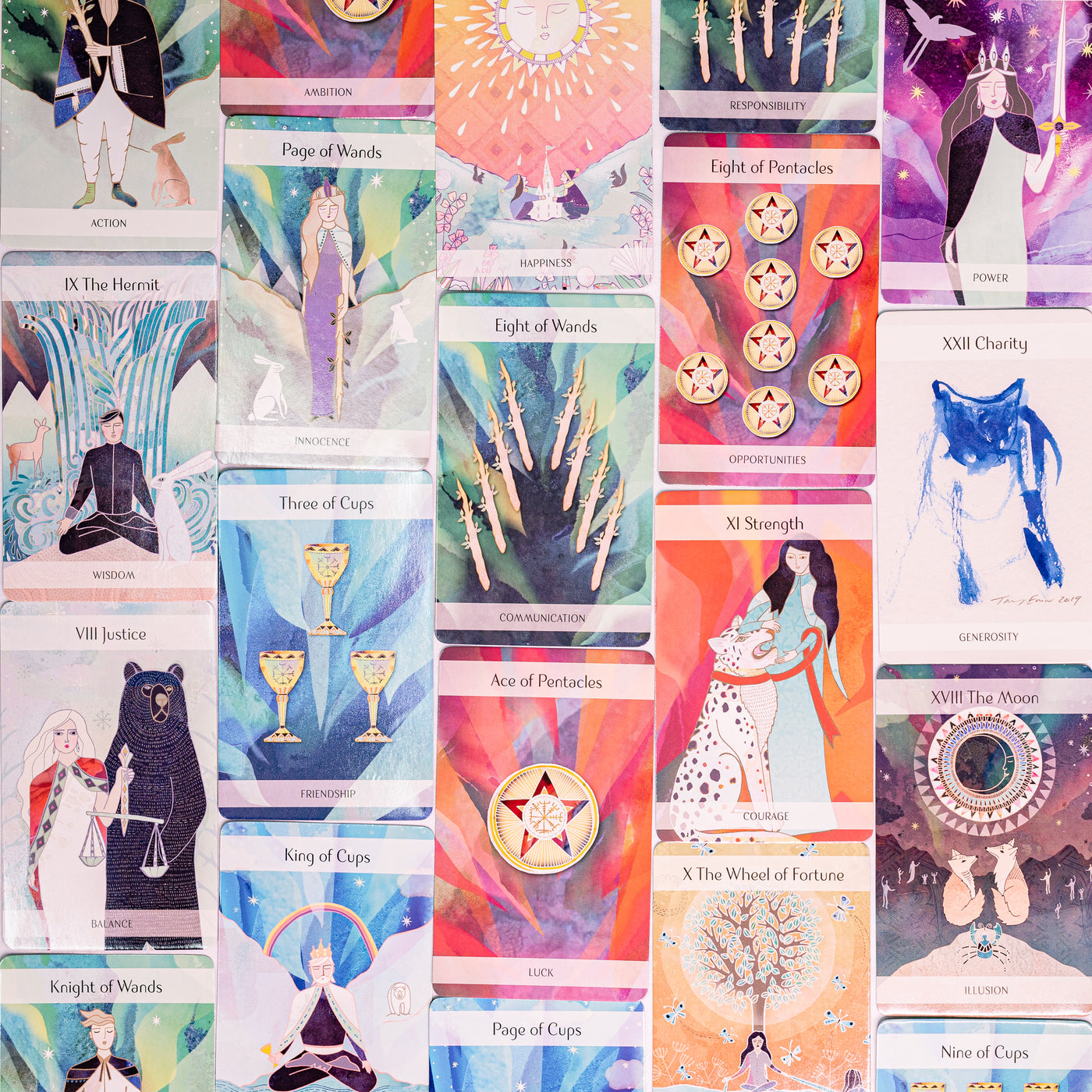 From images of symbolic animals (like wolves and bears), to depictions of the Northern Lights and Nordic Tree of Life, The Magical Nordic Tarot is filled with powerful imagery. There are references to the Nordic Gods and Goddesses, including Odin and Freya, and images of key Nordic symbols, such as the Nordic compass and Rune stones. References to some of the key characters in Nordic myths include a mischievous squirrel called Ratatoskr, who would run up and down the Tree of Life stirring up trouble between the eagle on top and the serpent at the bottom. The deck also includes a book giving detailed information about each card, along with key words, an inspirational message and interesting Nordic legends (many believe the Northern Lights were the souls of lost soldiers).