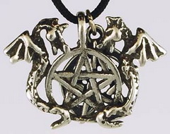 A powerful talisman, the twin dragons pentagram portrays two winged dragons on either side of a pentagram as a sacred symbol of power and protection. With the dragons representing the mysteries and powers of the universe, the pentagram itself is a time honored symbol representing the elements mingled with the mind, or the spirit, resulting in oneness with the universe. Measuring 1"wide and 3/4" long, the pendant has beens culpted of pewter and is accompanied by a solitary, interwoven pentagram charm upon its black nylon cord.