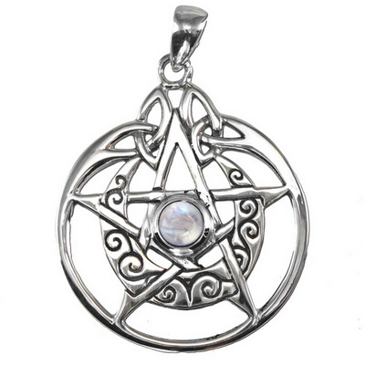 Sterling Silver Crescent Moon Pentacle Circle Pendant with Rainbow Moonstone