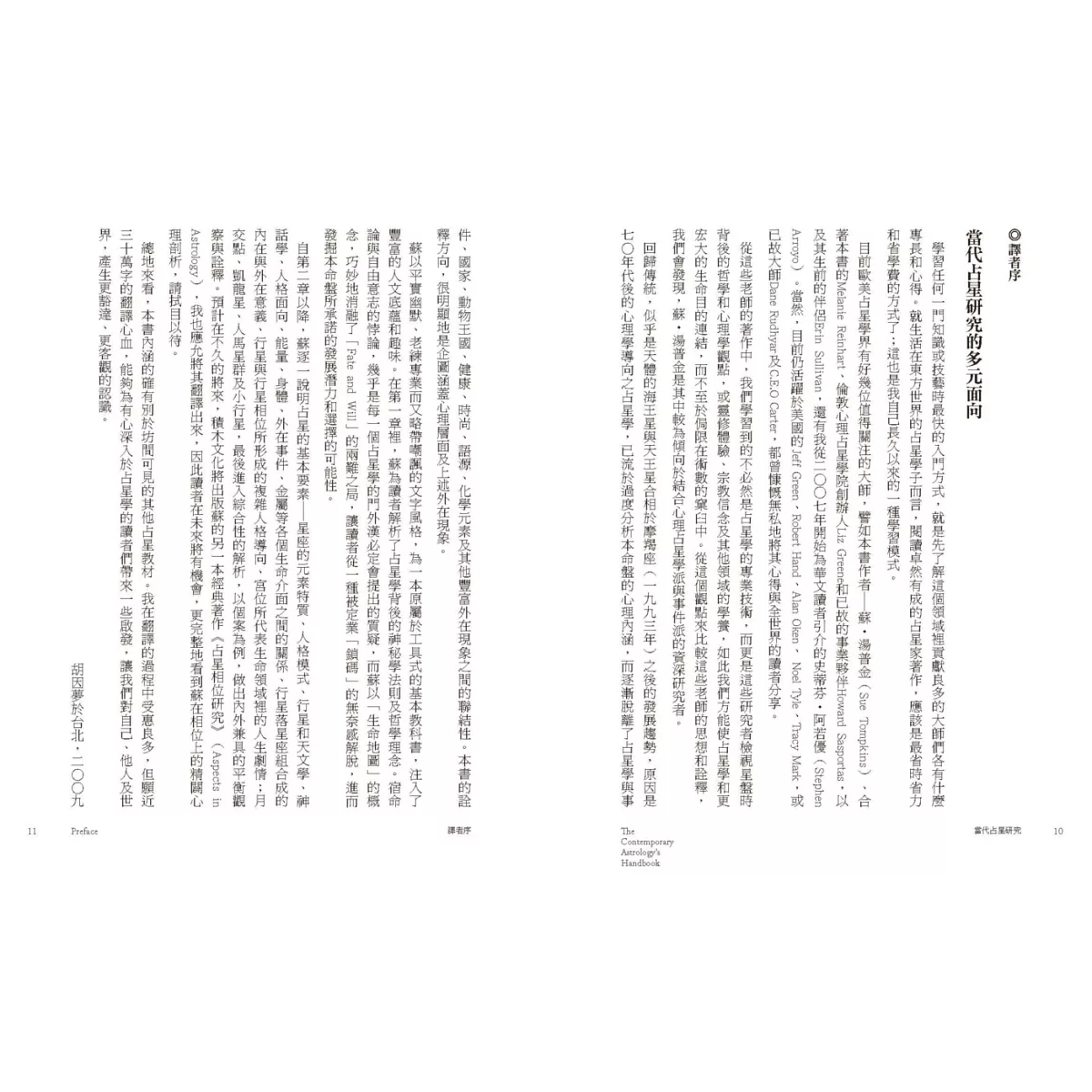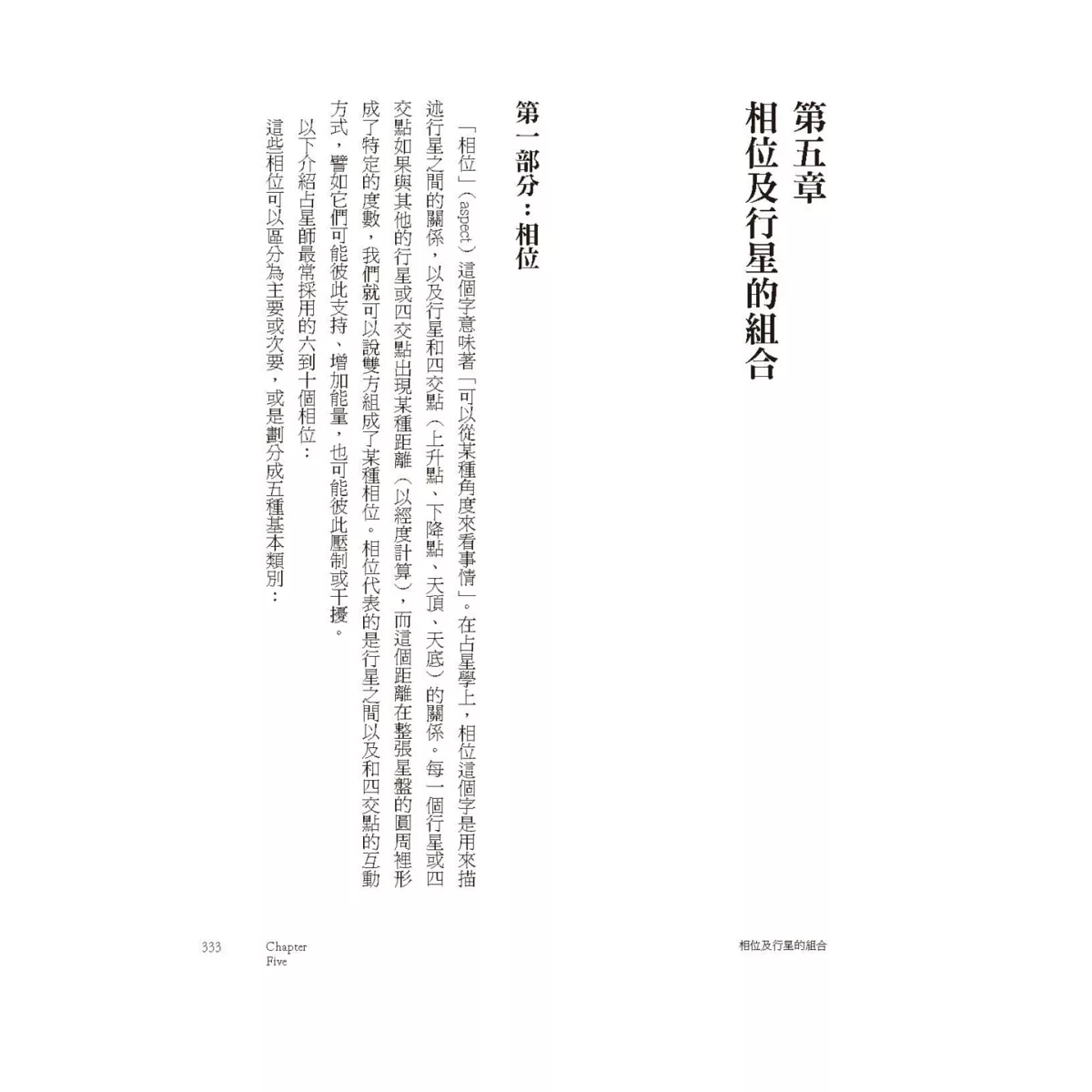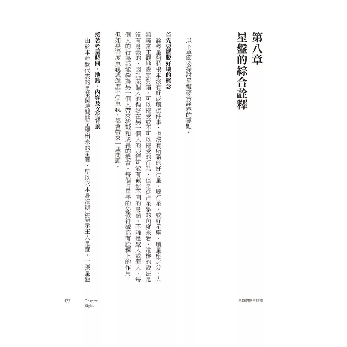 本書架構謹嚴,以易於理解的語言和精微的概念,充分說明占星學的歷史背景、基礎理論、黃道十二星座的意義、宮位象徵、相位圖型、案例分析、星盤解讀。其內涵可用以檢視包括人格模式、心理需求、情緒處理、人際互動、生涯發展及過往歷史等各個人生面向。目前市面上幾乎沒有一本占星教材,能涵蓋如此廣泛和透徹的內容。更難能可貴的是,本書譯筆優美流暢,行文中機鋒畢現,將重量級的專業論著演繹為精彩絕倫的札記,讓人沉浸其中,為之著迷而不忍釋卷,絕對是有志於占星學習者的必備經典,也是理解占星精髓的專業指南。