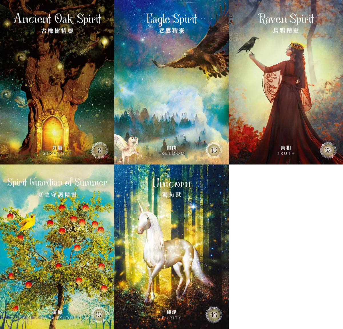 ●牌卡描繪古代自然精靈和土地守護者,呈現獨特迷人的視覺畫面。