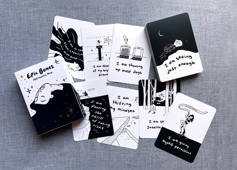 The whimsical Epic Bones illustrations on each card serve as a visual aide to deepen the understanding of each affirmation as you step into your future. On the back of each card is a supporting question to help further reflect and apply the meaning to your specific situation.