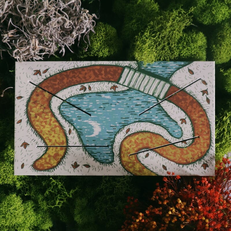 I wanted to design something to hold the entire collection together. I was inspired by my childhood making dioramas. I took the simple elegant style of the individual Green Glyphs deck boxes and designed a diorama on the inside of the box that reveals itself as the decks are removed.