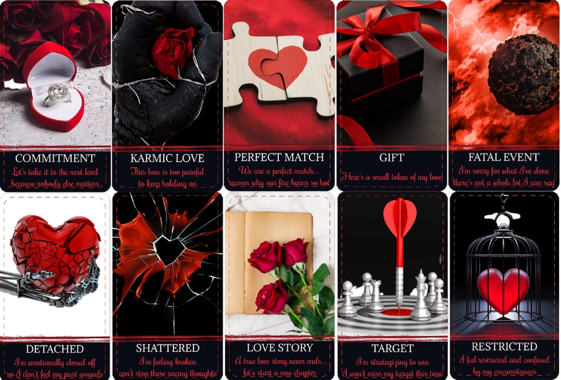 The artist created this deck because she love red, and wanted to create a deck that had every possible love "situation" in one deck, reason why there's 100 oracle cards. This deck is great to add a passionate mood to your readings and help you understand any twin flame, karmic or soulmate romantic connection. You can unveil your partner's true feelings or simply use it to see the current energies in a connection and see what's next .... These cards are very blunt so if you are easily triggered and want more light please do not buy this deck