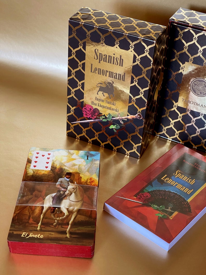 Our oracle is based on the Game of Hope and the Small Lenormand Oracle. It consists of 36 cards-symbols, which are traditional for this deck. We’ve tried to fill them with the uncompromising brightness of the Pyrenean colors and the magical aura of the Iberian witches, las brujas. The images are as clear and obvious as the shadows of palaces and trees on a sultry Spanish day at noon. That’s why they are simple and at the same time very rich when reading the spreads. This deck is a wonderful cartomancy instrument because we’ve invested in its creation our more than 20-year experience of working with the Lenormand system. It is also a great collectible, having been created with much love for Spain and its unique culture.