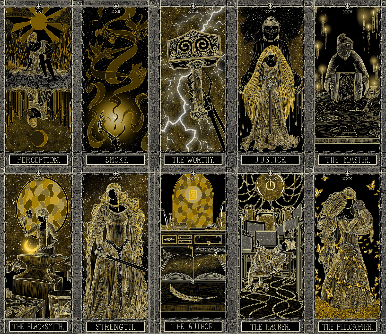 It was created in collaboration with the backers from the Kinner Tarot deck, from which this deck was made possible.