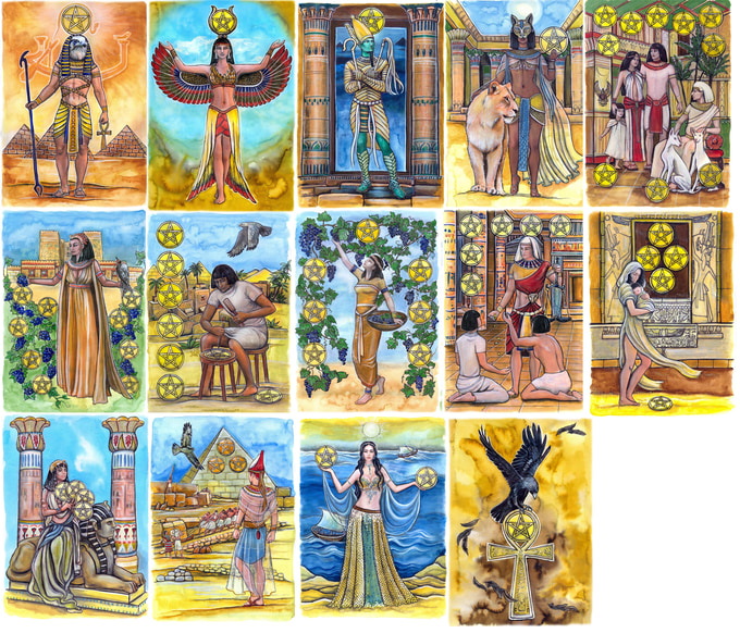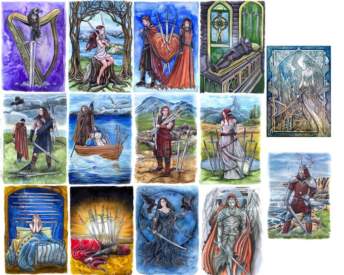 這副牌的小牌設計與"存在之旅"塔羅牌類似,每個牌組對應一個神話體系:權杖牌組是北歐神話,聖杯牌組是斯拉夫神話,寶劍牌組是凱爾特神話,金幣牌組則是埃及神話。除了保留凱爾特結構,牌面也變成滿版設計,更有代入感。