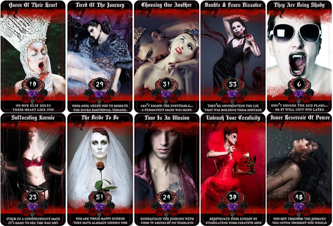 The artist created this Vampire Theme deck for twin flame connections but not exclusive to just TF, can be used for any other love connection. Uncover the hidden truths within your union.