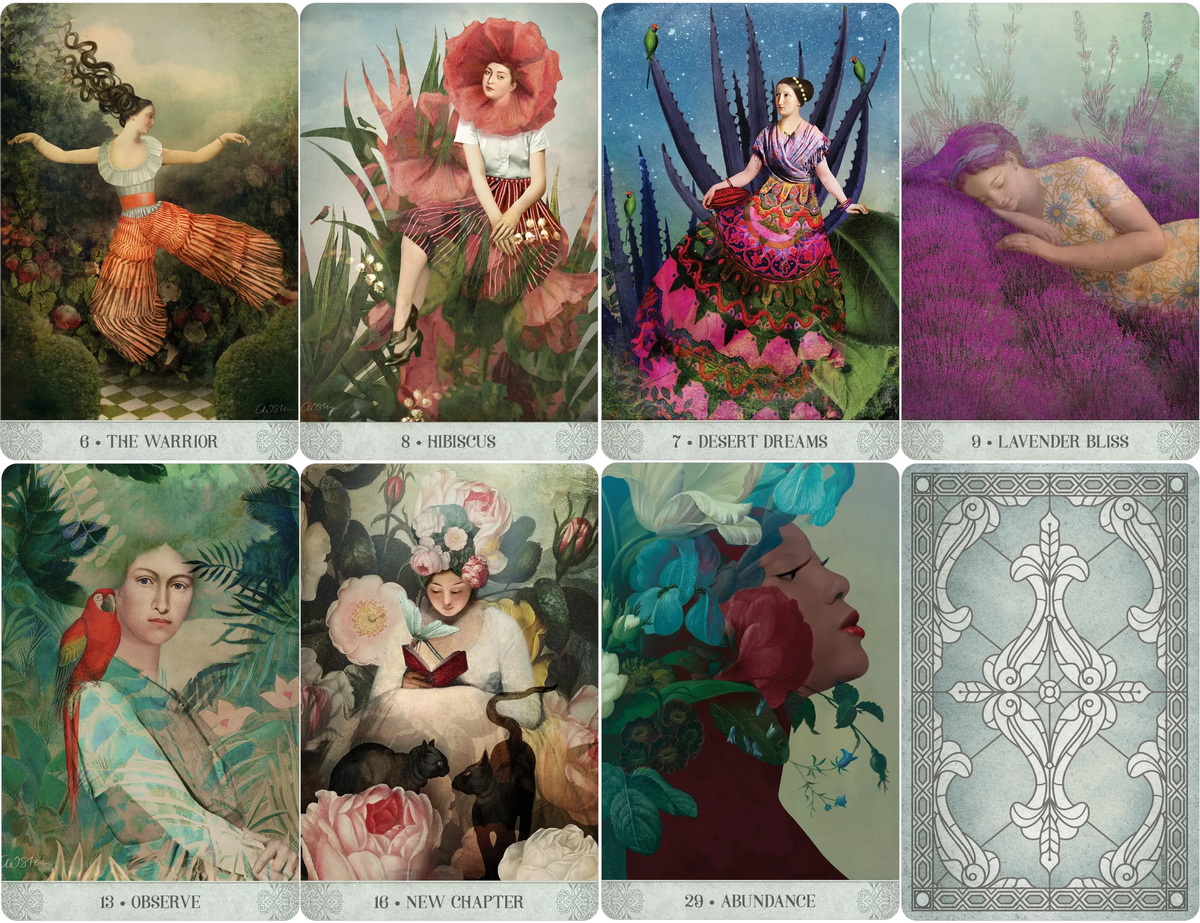 Welcome to the Garden of Wisdom. Here, you will encounter luscious landscapes and botanical collages full of visual and emotional elements to be explored in much the same way you would delve into dream imagery for self-knowledge. From the moment the sun rises in the morning and the birds begin their sweet songs, the garden sanctuary welcomes you with gentle gifts of insight, inspiration and healing. The 56 cards and 68-page full-color illustrated guidebook lead you along the pathway through transformation and enlightenment. All you need to bring is your imagination and each time you visit you will discover something new.