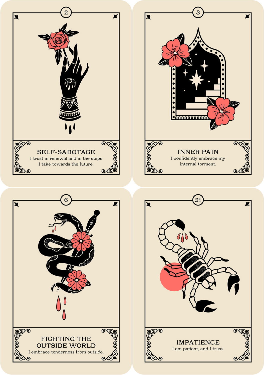 We all carry soul wounds and the blocks our unconsciousness created to protect us. By learning to accept your inner wounds, you will be able to deconstruct the blocks that weigh you down and accept yourself at your deepest level: this is the greatest gift you can give yourself. This 42-card oracle illustrated by Daphna Sebbane will help you to receive messages from your traumatised self and become aware of your deepest needs and desires. Through this work, your wounds and blocks will turn into positive energy. Allow yourself to love all the complex layers of who you are and reveal your inner magic.