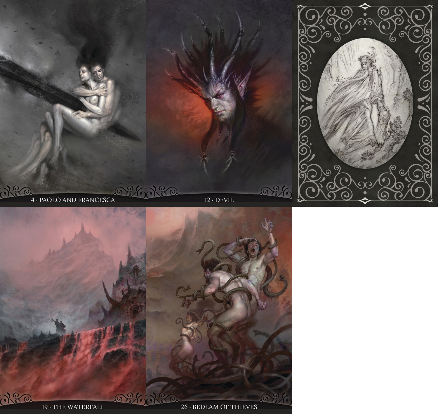 The new Oracle deck by celebrated Italian artist Paolo Barbieri gives life to the legendary episodes recounted by Dante Alighieri in the first cantica of the Divine Comedy. A literal journey through the circles of hell, but also an allegorical exploration of the dark side of our soul and the tragic depths of human condition.