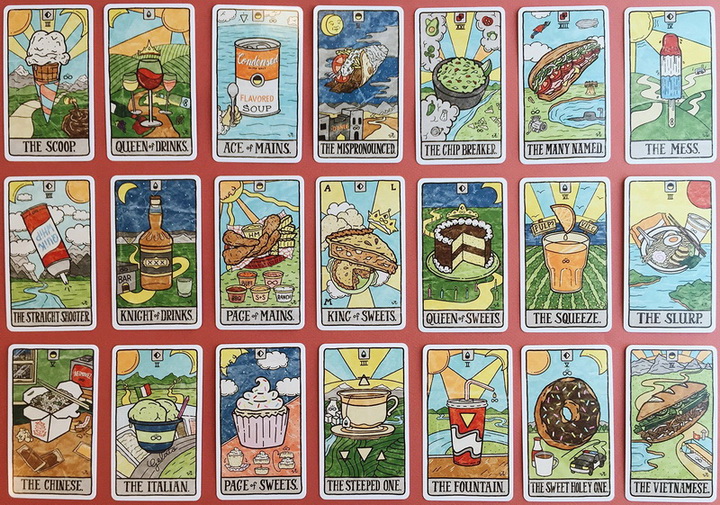 This playful take on tarot makes divining the sacred mysteries of what's for dinner tonight? a snap. Simply lay the cards out three at a time and voila-a meal appears, a vision from the spirit realm. This dining divination game can be played alone or with hungry friends to give apathetic appetites a mystical nudge in the right direction.