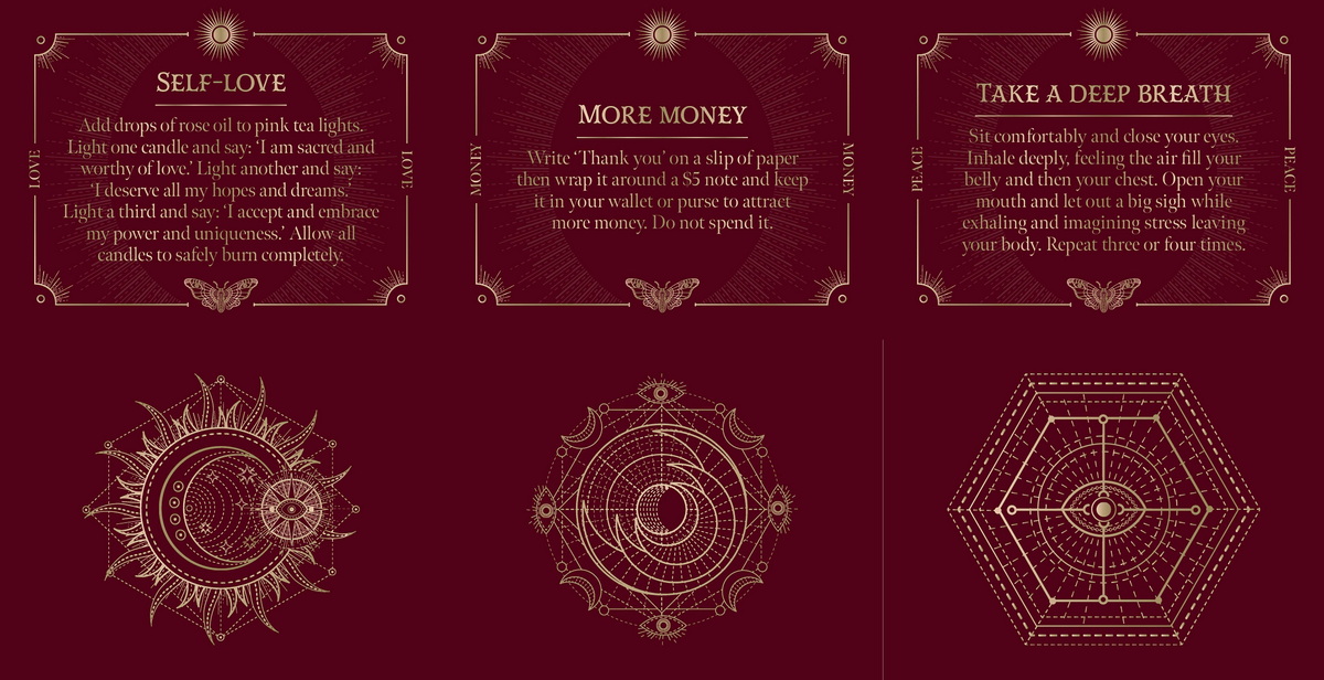 This little deck of witchery will have aspiring witches casting easy, practical spells in no time at all. Choose a card based on your intention or let your intuition guide you to what you need by pulling one at random. Love, money, peace, protection, for the home or work, travel or play, there's a spell for that and it only takes a moment.