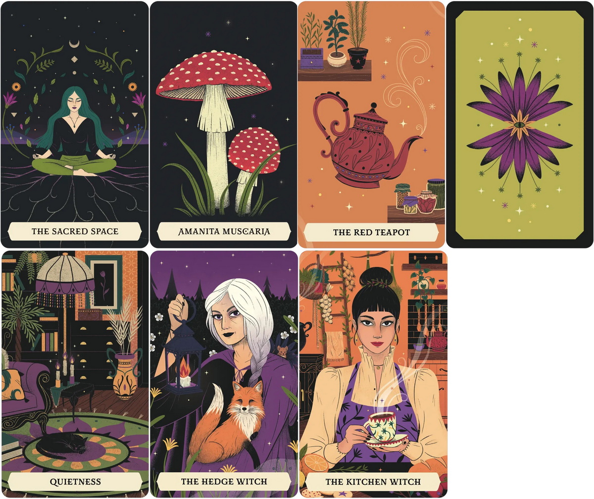 The Secret Oracle of the Green Witch guides you through an enchanted garden into the heart of the woods, where the Green, Hedge and Kitchen Witches reveal their special magic. Learn to listen to the voices in the woods and receive their messages through symbols and stories. Recognize the plants, animals and natural elements used for charms, talismans and potions. The deck brings together the important herbs, tools, tales and inspiration you’ll need for your spellwork. Includes 50 cards and 65-page illustrated guidebook.