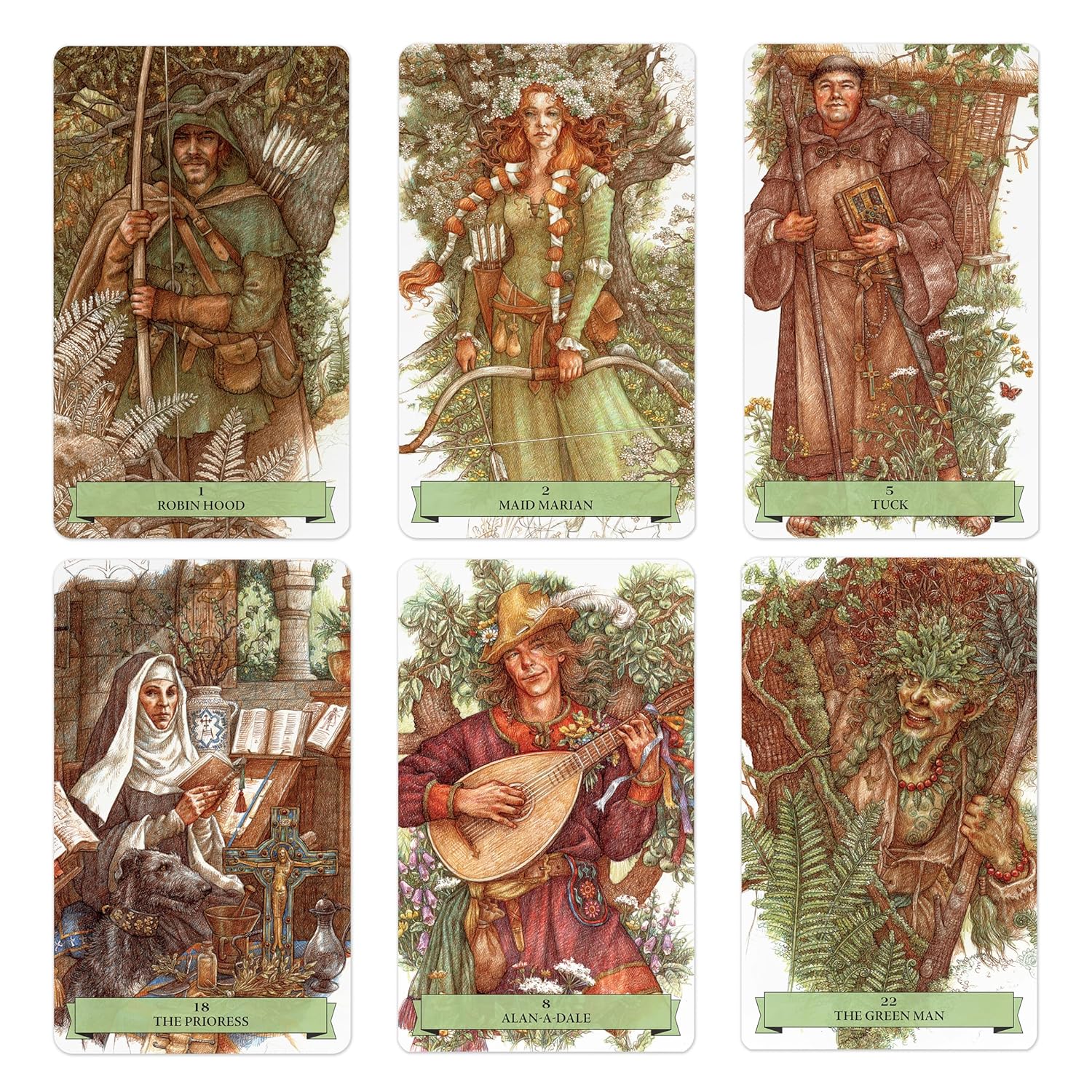 本產品需要付全數訂金訂貨,一般需時約 2-4 星期到貨。The lore behind the figures Robin Hood and the Merry Men are some of the most enduring of all myths and legends, and their paths affect everyone who reads about them. This is a deck that breathes life into the forests of Sherwood, where romance, heroism, and the supernatural occur in equal parts, and questions about the most archetypal characteristics found in the human psyche can be answered. Written by the creators of the bestselling The Wildwood Tarot—including Mark Ryan, who starred in the cult-favorite TV series Robin of Sherwood—and illustrated by iconic artist Anne Yvonne Gilbert, this is an enchanting and enlightening tool for uncovering the legends hidden in the human subconscious.