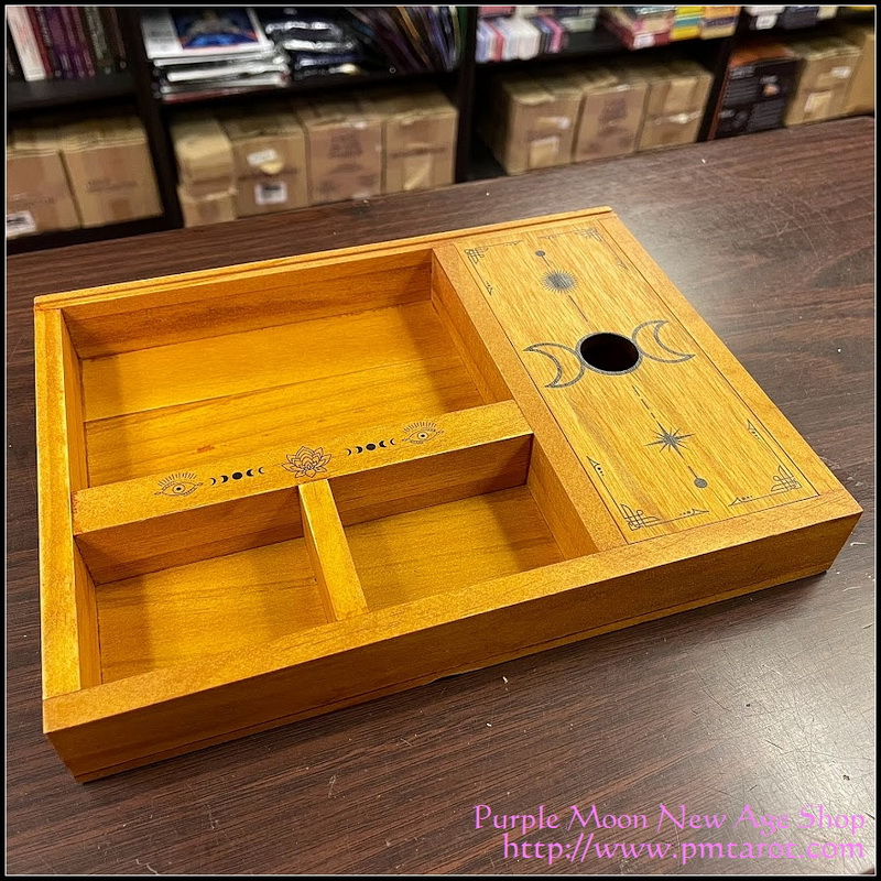 用於展示塔羅牌,盧恩牌或其他神諭牌的木架,也可用於祭壇之中配合塔羅或盧恩以進行魔法。前面有四格位置可以放置你的水晶,占卜石,靈擺,聖木或鼠尾草,占卜或儀式等工具,其中一格附有蓋板。